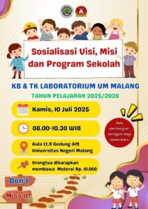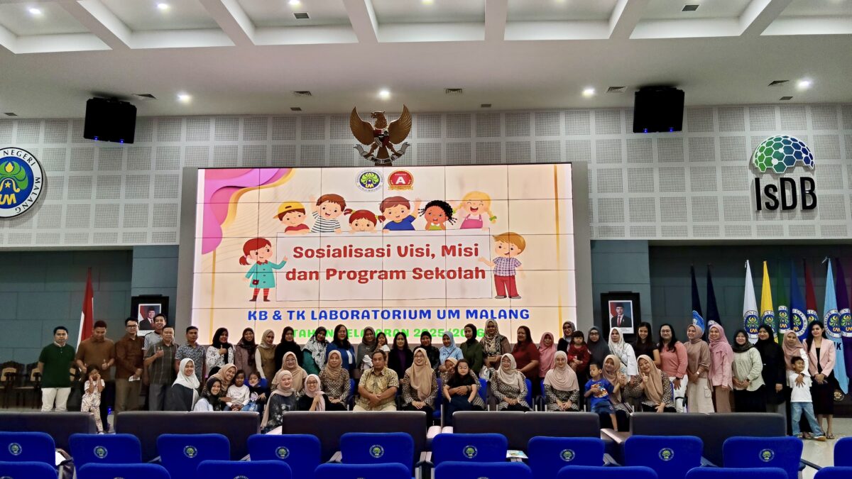 Sosialisasi program sekolah KB & TK Laboratorium UM Malang tahun pelajaran 2025/2026 adalah kegiatan penyampaian informasi mengenai program-program yang akan dilaksanakan di sekolah selama satu tahun pelajaran kepada orang tua/wali murid. Kegiatan ini tujuannya adalah untuk menyamakan persepsi dan membangun kerja sama antara pihak sekolah dan orang tua dalam mendukung program kegiatan belajar mengajar (kurikulum, metode pembelajaran, dan kegiatan yang akan diikuti peserta didik selama setahun), sosialisasi tata tertib sekolah, dan mendukung tumbuh kembang anak.