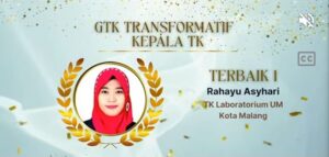 Malang, Jawa Timur — Rahayu Asyhari S.Pd., M.Pd., Kepala Sekolah KB & TK Laboratorium Universitas Negeri Malang (UM), meraih Penghargaan GTK Transformasi – Kepala TK dari Balai Besar Guru dan Tenaga Kependidikan (BBGTK) Jawa Timur. Penghargaan ini diberikan sebagai bentuk apresiasi atas dedikasi dan kontribusinya dalam meningkatkan mutu pendidikan anak usia dini.
