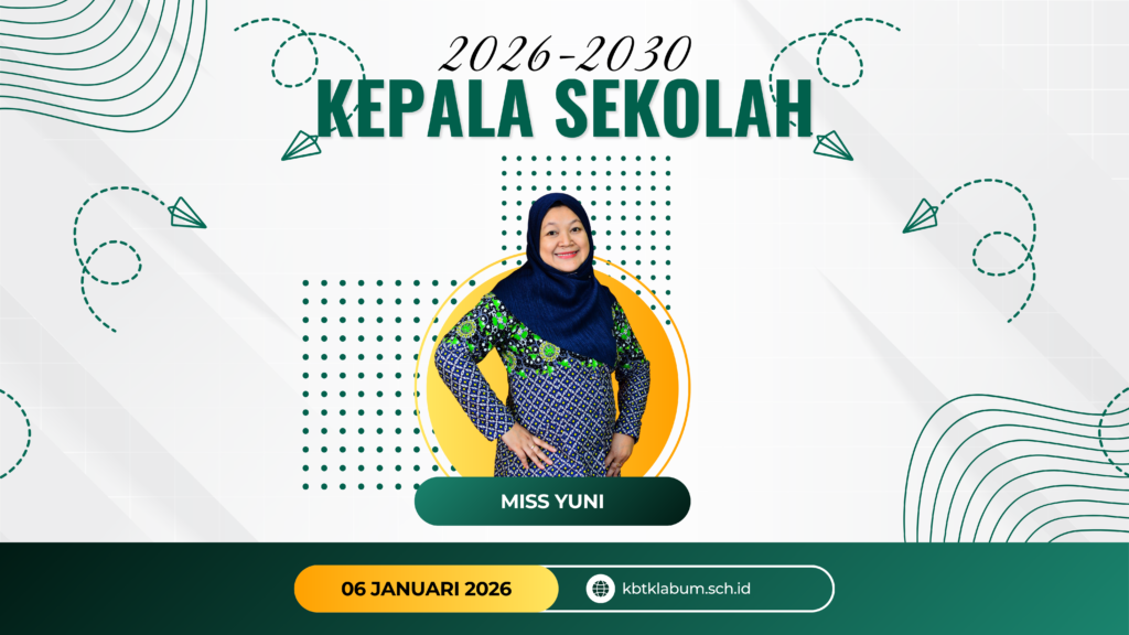 Terhitung mulai 6 Januari 2026 hingga tahun 2030, Miss Yuni, S.Pd. resmi menjabat sebagai Kepala Sekolah KB & TK Laboratorium UM Malang. Diharapkan dengan kepemimpinan yang baru, lembaga ini dapat terus berinovasi dan memberikan kontribusi terbaik dalam dunia pendidikan anak usia dini.