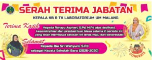 KB & TK Laboratorium Universitas Negeri Malang (UM) melaksanakan kegiatan penyerahan jabatan Kepala Sekolah pada Selasa, 6 Januari 2026. Kegiatan ini menandai berakhirnya masa jabatan Kepala Sekolah sebelumnya, Miss Rahayu Asyhari, S.Pd., M.Pd., dan dilanjutkan dengan penunjukan Kepala Sekolah yang baru, Miss Yuni, S.Pd., yang sebelumnya menjabat sebagai guru kelas TK A Meteor.